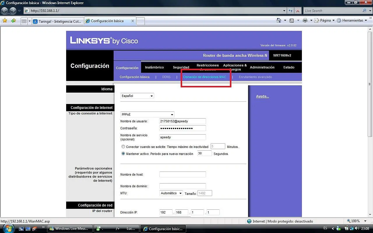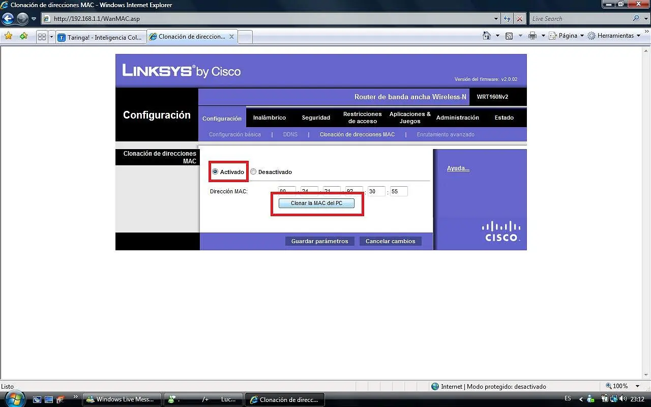 y le damos a la pestaña "clonar la direccion mac del pc"