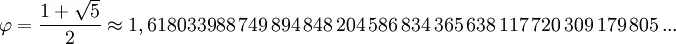 El número de oro, número dorado, sección áurea, razón áurea, razón dorada, media áurea, proporción áurea y divina proporción, representado por la letra griega Φ (fi) (en honor al escultor griego Fidias), es el número irracional: