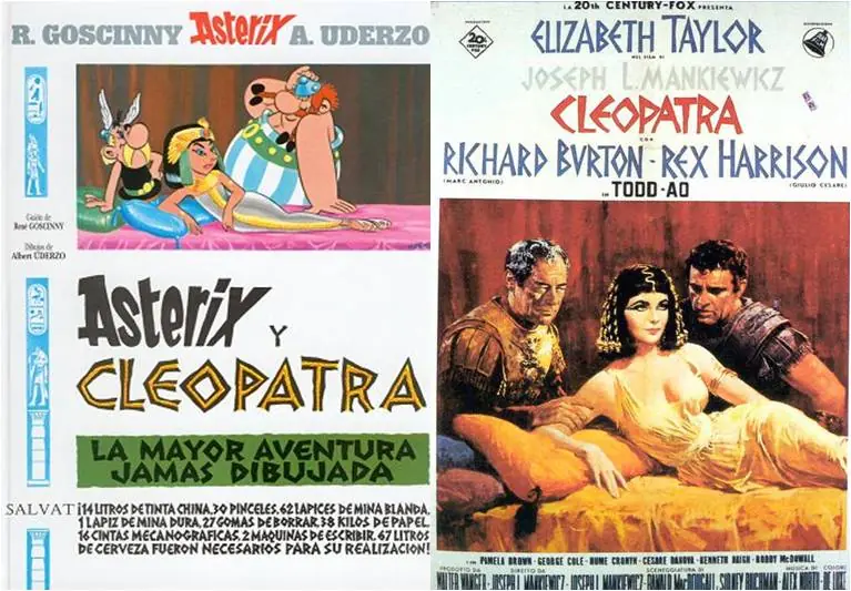 - En la historia hay varias referencias a la película 'Cleopatra', dirigida por Joseph L. Mankiewicz y protagonizada por Elizabeth Taylor, Richard Burton y Rex Harrison que se estrenó en 1963 y que Goscinny y Uderzo vieron juntos antes de decidirse a realizar este álbum. La primera referencia es imagen de la portada del álbum que se asemeja en gran medida al cartel de la película.