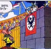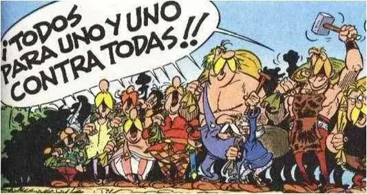 - Los habitantes de la 'Aldea de los locos', gritan 'todos para uno y uno contra todas' muy parecido al lema de los mosqueteros 'Todos para uno y uno para todos'.