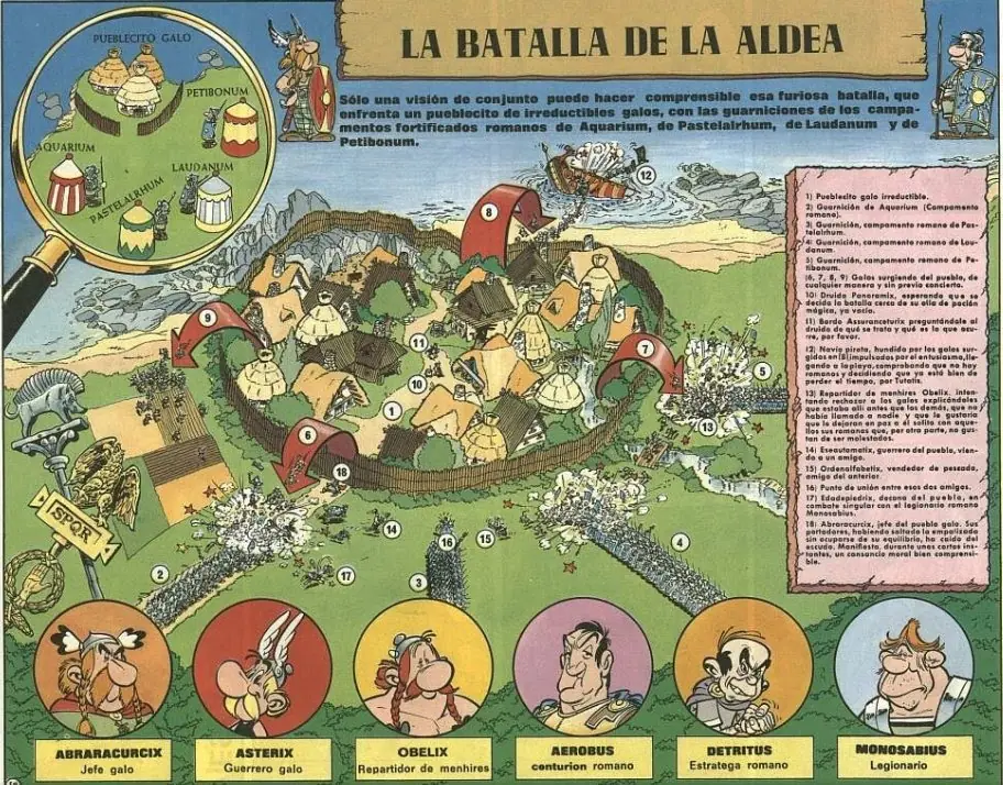 La aventura incluye un detallado mapa de la aldea en la batalla en la que los galos se enfrentaron a legiones de los 4 campamentos romanos que la rodean: