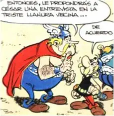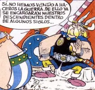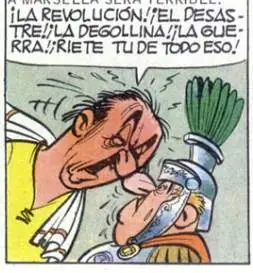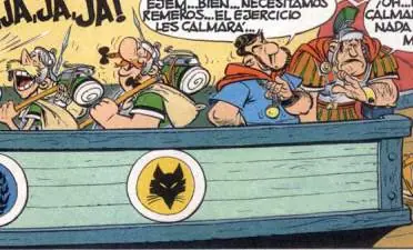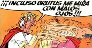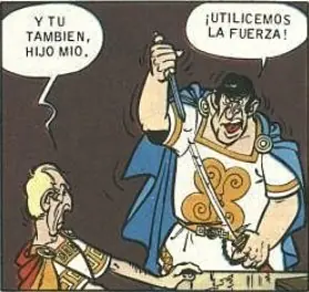 - Aparece Brutus junto a César agarrando un puñal haciendo referencia a la fuerza como método para acabar con los galos. César pronuncia su conocida frase 'Tú también, hijo mío'. Es una refeferencia al asesinato del César en el 44 a.C.