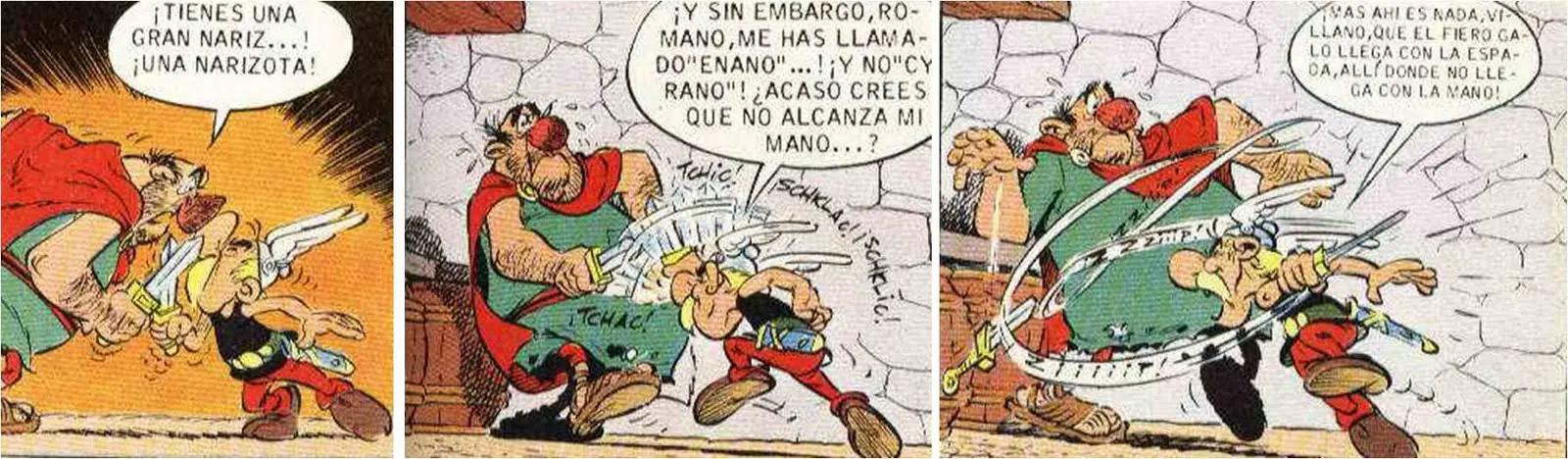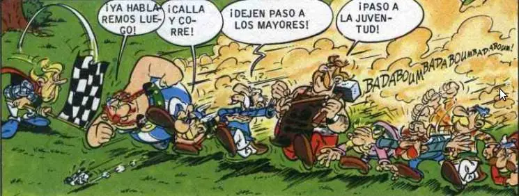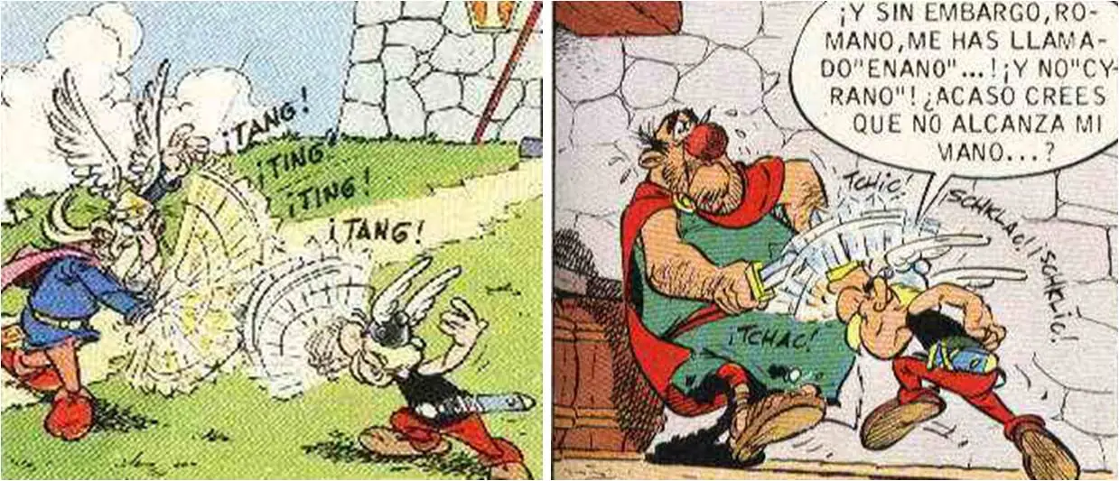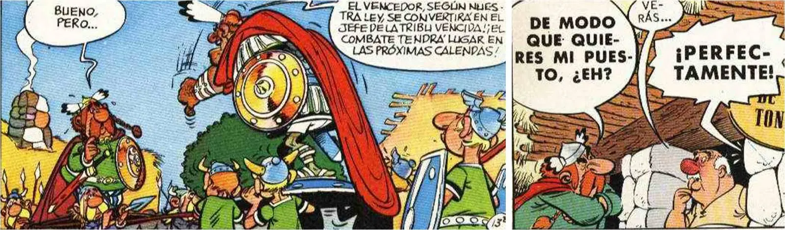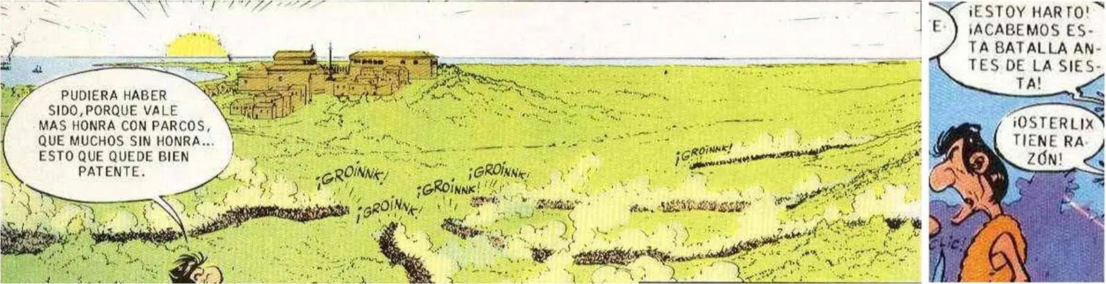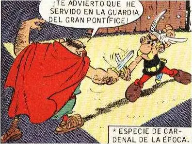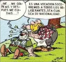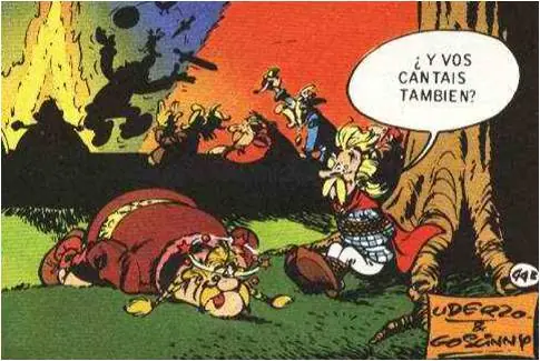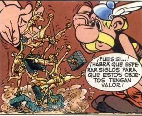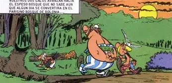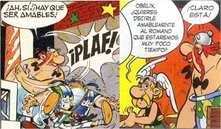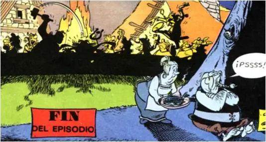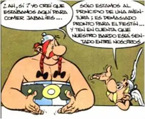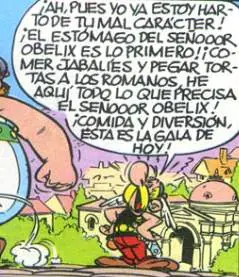 - La siguiente viñeta extraída durante una discusión entre Astérix y Obélix hace referencia al famoso 'Panem et cincenses': Obélix está contento mientras tenga jabalíes y romanos a los que pegar tortas.