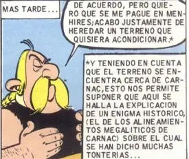 - En esta viñeta Ordenalfabétix hace referencia a los alinamientos megalíticos de Carnac (ver imagen en las curiosidades de la aventura 'El hijo de Astérix'). En la versión inglesa cambiaron Carnac por Stonehenge, ya que los lectores británicos se sienten más identificados con dicho monumento megalítico. En ambos casos se produce un error con las fechas, ya que Carnac data del 4500-3300 a.C.