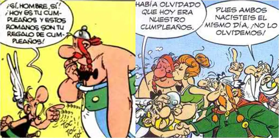 - En este álbum, se celebra el cumpleaños de Astérix y Obélix ya que se cuenta que nacieron el mismo día, sin embargo, en 'Obélix y compañía', se celebra el cumpleaños de Obélix y no se menciona para nada que ese mismo día sea el cumpleaños de su amigo Astérix. Esta circunstancia, que en un principio pudiera extrañar, puede explicarse fácilmente sólo con considerar que tampoco se dice lo contrario, es decir que no se mencione que ese día es también el cumpleaños de Astérix no significa que no lo sea, sino que al ser una historia centrada en Obélix, el protagonismo es suyo.