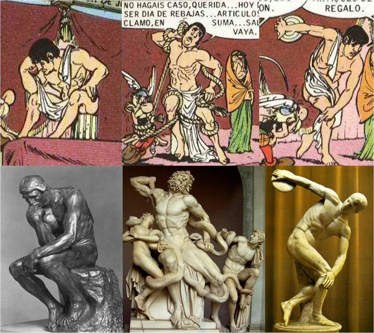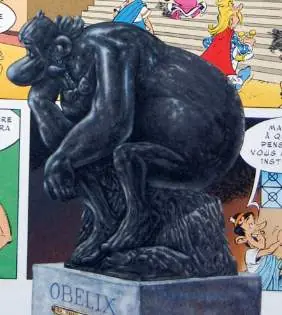 - El pensador: Sin duda, la más célebre escultura de Rodin. Titulada inicialmente por su autor El Poeta, y luego, Dante Pensando. La estatua ubicada en el museo Rodin de París se caricaturiza con Obélix en esta aventura, aunque al 'adivino' parece no gustarle demasiado.