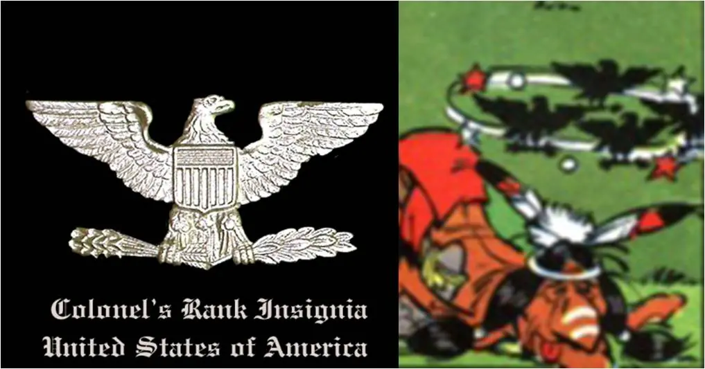 - Cuando un nativo norteamericano cae del árbol que sacude Obélix, aparecen águilas calvas sobrevolando su cabeza. Estas águilas además de ser el emblema nacional de EE.UU. aparecen en diversas insignias militares del ejército norteamericano.