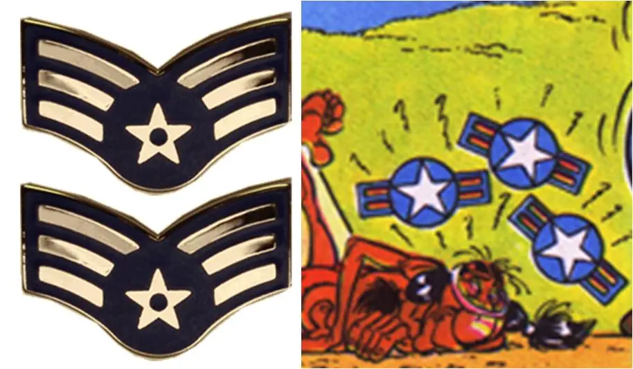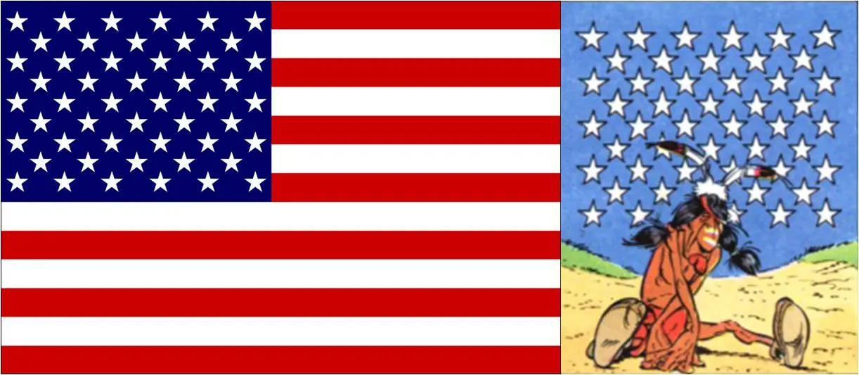 - Al recibir un tercer golpe por hacer el indio, Obélix vuelve a golpear al mismo nativo que de nuevo ve las estrellas, en esta ocasión las de nuevas insignias militares del ejército de EE.UU.