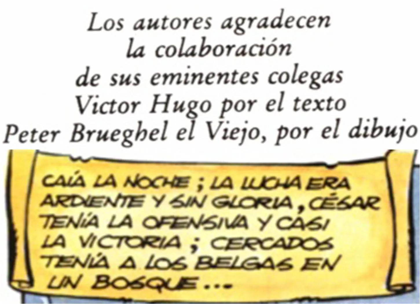 - El álbum comienza con el agradecimiento de los autores a Víctor Hugo por el texto y a Peter Brueghel el Viejo, por el dibujo. De Víctor Hugo, se toma 'La expiación', de la colección 'Los castigos', como modelo para la narración que aparece en los pergaminos de la batalla entre romanos y belgas del final del álbum, parodiando de esta manera la batalla de Waterloo.