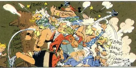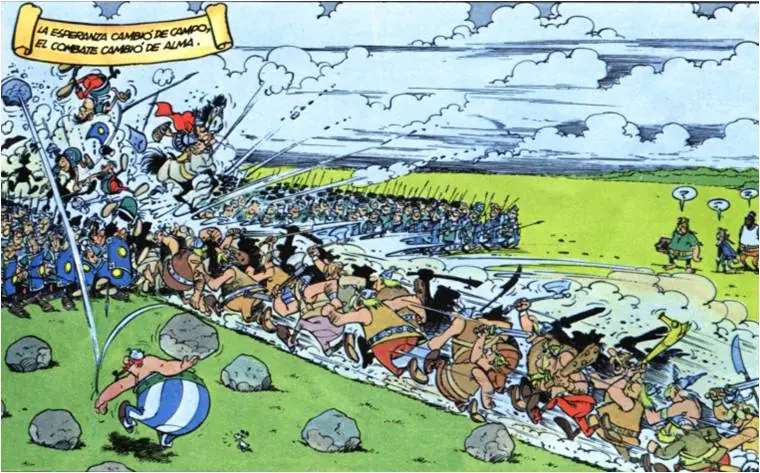 La siguiente viñeta también recrea la batalla, Obélix lanzando piedras recuerda una batería de artillería y el ataque de los belgas, una carga de caballería.