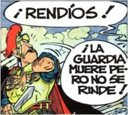 Al igual que sucediese en 'Astérix en Córcega', se vuelve a aludir a la frase a la frase del general Pierre Cambronne durante la batalla de Waterloo: '¡Mierda!... ¡La guardia muere, no se rinde!', en esta ocasión la pronuncia Yoconestospelus.