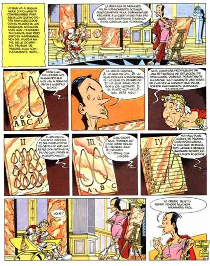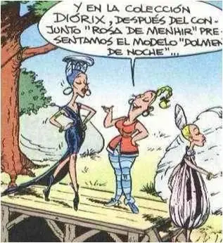 - En el álbum presenciamos un desfile de modelos que presentan la colección de primavera Diórix un diseñador galo de Lutecia, en clara referencia al diseñador francés Christian Dior.