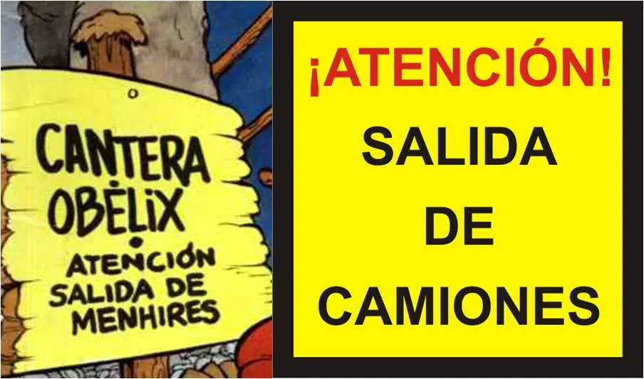 - El letrero que aparece en la 'Cantera Obélix', indicando la salida de menhires es una referencia a la señal de tráfico sobre salida de camiones.
