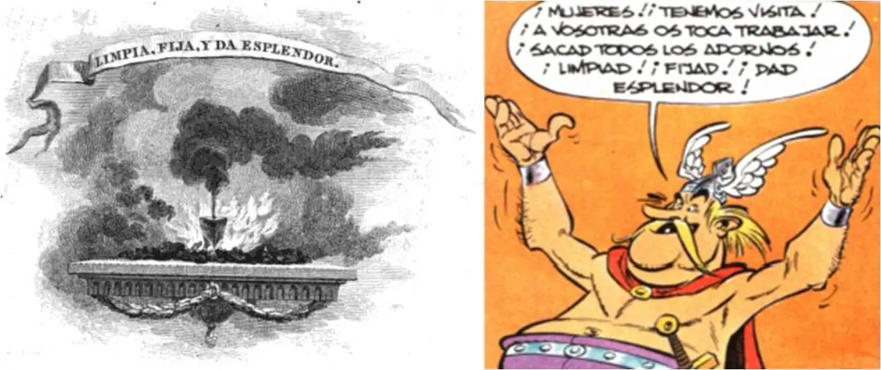 - Cuando Gueusealambix exclama '¡Limpiad! ¡Fijad! ¡Dad esplendor!' Está haciendo una referencia a la leyenda que figura en el emblema de la Real Academia Española: 'Limpia, fija y da esplendor'.