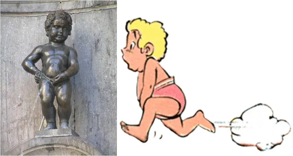 - El pequeño Manneken es una evidente referencia a la estatua conocida como Manneken Pis (en dialecto bruselense Menneke Pis, 'niño que orina'). Se trata de un de bronce de unos cincuenta centímetros situada en el centro histórico de Bruselas que representa a un niño pequeño desnudo orinando dentro del cuenco de la fuente. Es uno de los símbolos de la ciudad y una de sus principales atracciones turísticas, simbolizando el espíritu independiente de sus habitantes.