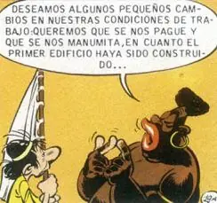 - En la aventura hay una referencia humorística a los derechos de los trabajadores cuando el númida Duplicatha (en poder de la poción mágica) hace valer sus derechos laborales ante la amenaza de utilizar la fuerza si no se cumplen sus deseos.