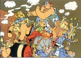 - Banquete final, se celebra en la aldea sin la presencia de Astérix, Obélix ni Asuranceturix, por lo que podemos ver a un Eseautomátix muy disgustado y separado del resto.