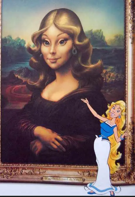 - La Mona Lisa: La misma aventura recrea muchos otros cuadros muy conocidos en los que se integran los personajes de las aventuras. Tal es el caso de la Mona Lisa, del mismo autor que el hombre de Vitrubio, en el que Falbalá hace las veces de Gioconda.