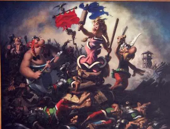- La libertad guiando al pueblo: Célebre obra de Delacroix que recoge los hechos revolucionarios ocurridos en las barricadas de París en 1830. Se caricaturiza con los personajes más conocidos de las aventuras de Astérix con Karabella haciendo las veces de la libertad.