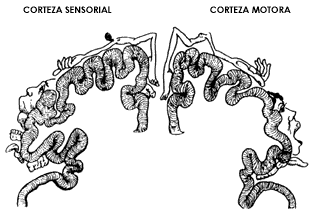Figura I.2. Mapa del homúnculo (hombrecito). Área en la que se ubican las neuronas en la corteza sensorial y en la corteza motora que tienen bajo su control las distintas regiones del cuerpo, la cabeza y las extremidades.