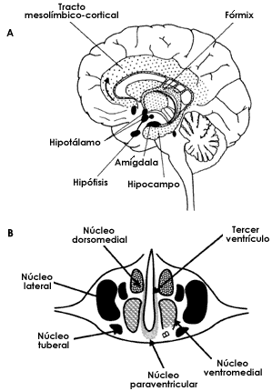 Figura I.4. A) localización del hipotálamo en el cerebro. El hipotálamo forma parte de un conjunto de estructuras cerebrales conocidas como sistema límbico (punteado) que participan de manera importante en la modulación de las emociones. B) en el hipotálamo se encuentra una serie de núcleos (grupos de neuronas) que tienen a su cargo funciones relacionadas con la generación, supresión y regulación.