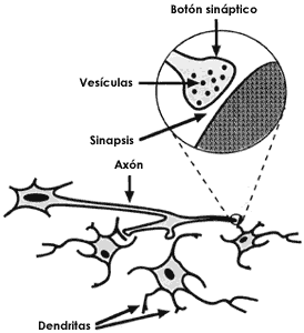 Figura I.6 Una neurona típica está formada por el soma y dos tipos de prolongaciones: las dendritas, cortas y ramificadas y el axón, más largo. En el extremo del axón se establece la comunicación con otras neuronas a través de las terminaciones o botones sinápticos que contienen las vesículas sinápticas donde se almacenan los neurotransmisores.