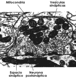 Figura I.7. Estructura de la sinapsis en la que se observan el espacio sináptico, las vesículas sinápticas de la neurona presináptica y los engrosamientos típicos de la neurona postsináptica.