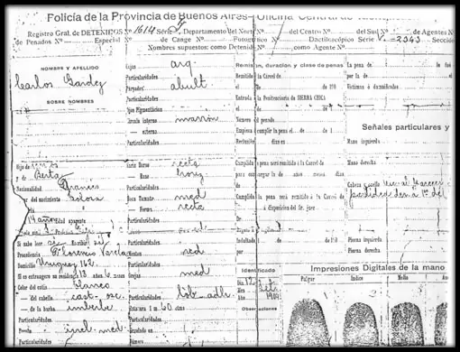 15) Documento de detención Nº 1614 del 11 de septiembre de 1904 del Partido de Florencio Varela, donde figura con 13 años, tipógrafo, alfabeto, francés, hijo de Bertha Gardés, domiciliado en Uruguay 162 C. Federal. Tiene una cicatriz en el lóbulo de la oreja derecha. Deja su firma e impresiones digitales, coincidentes con pericias forenses posteriores.