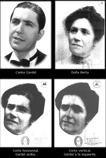 La segunda imagen con un corte oblicuo, casi vertical, mezclando las dos fotos. Donde Gardel está a la izquierda y doña Berta a la derecha.