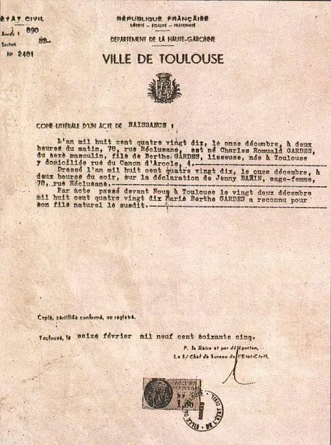 Carlos Gardel nació en la ciudad de Toulouse, Francia, el 11 de diciembre de 1890. Hijo de padre desconocido y Berta Gardes, quien le dio su apellido, fue bautizado Charles Romuald Gardes.