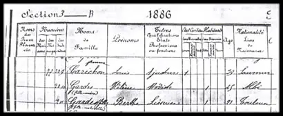 7) En el Censo Nacional Francés de 1886 Sección 3. B. Familia N° 77, figuran residiendo en la misma calle de Burdeos. Berthe se registra con 21 años de profesión alisadora (planchadora), Código 211, hija de Helene Camarés, nacida en Toulouse. También está Charles Gardés, de 11 años, nacido en América del Sur, hijo natural Helene y Louis Carichou.