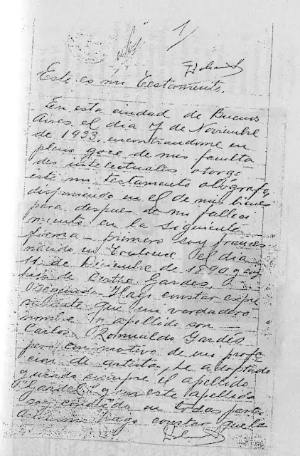«Este es mi testamento. En esta ciudad de Buenos Aires el día siete de noviembre de 1933, encontrándome en pleno goce de mis facultades intelectuales otorgo este mi testamento ológrafo, disponiendo en él de mis bienes para después de mi fallecimiento, en la siguiente forma: primero soy francés nacido en Toulouse, el día 11 de diciembre de 1890 y soy hijo de Berthe Gardes, segundo –hago constar expresamente que mi verdadero nombre y apellido son Carlos Romualdo Gardes, pero con motivo de mi profesión de artista, he adoptado y usado siempre el apellido "Gardel" y con este apellido soy conocido en todas partes. Asimismo hago constar que las cuentas que tengo en los Bancos, expresamente en el Banco de la Nación Argentina, así como mis títulos de propiedad y demás papeles figuran invariablemente con mi nombre y apellido de adopción, o sea Carlos Gardel- tercero. Soy de estado soltero y no tengo hijos naturales- cuarto- no debo suma alguna y perdono todo lo que me deben. Mis bienes resultarán de los títulos y papeles que tenga a la fecha de mi fallecimiento- Quinto- Nombro por mi única y universal y heredera de todos mis bienes y derechos a mi nombrada madre Berthe Gardes.- sexto- Nombro mi albacea testamentario a mi amigo Armando Defino para que liquide mi testamentaria y asesore a mi nombrada madre durante la tramitación de la misma- No teniendo otras disposiciones que hacer, hago constar que el presente ha sido redactado de mi puño y letra y de una sola vez lo firmo en la fecha de arriba indicada. Carlos Gardel».