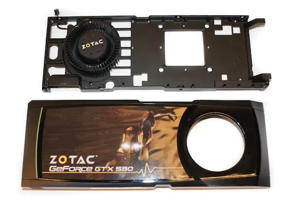 Zotac GTX 580 en toda su majestad, como vemos su diseño es identico al de referencia, salvo por la personalización de sticker sobre el plástico que cubre el disipador y el logo sobre el ventilador.