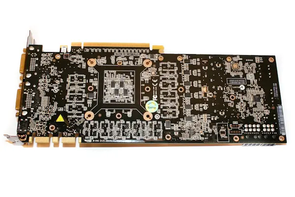 Aunque en la imagen no se aprecian bien las memorias, podemos contarles que se tratan de memorias SAMSUG K4G10325FE-HC04, GDDR5 de 0.4ns con una frecuencia de operación máxima de 1250Mhz (5000Mhz QDR), pero que en la GTX 580 vienen a 4008Mhz, por lo tanto, queda margen para overclock que luego exprimiremos.