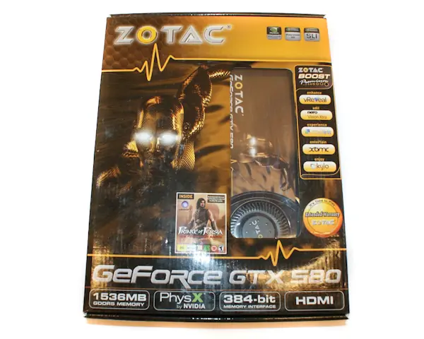 Lo primero que enfrentamos es un empaque de cartón de tamaño reducido, no es como los empaques gigantes que algunos fabricantes nos tienen mal acostumbrados, la caja presenta una ventana por donde se asoma el disipador de la GTX 580 con los logos del fabricante, dejando obviamente en claro que se trata de una Zotac , Además de las características clásicas que incluyen todos los fabricantes podemos ver que incluye el juego Prince of Persia, extras que siempre agradecemos a los fabricantes, más que mal son de 10 a 30 dólares de regalo.