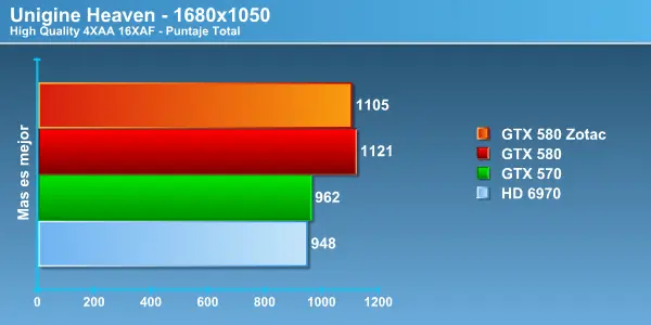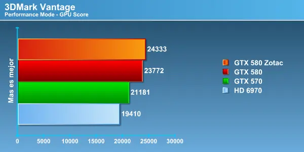 Acá vemos como en los benchmarks sintéticos con este pequeño overclock la GTX 580 literalmente se destapa escalando atractivamente, superando por bastante los puntajes obtenidos en frecuencias stock.