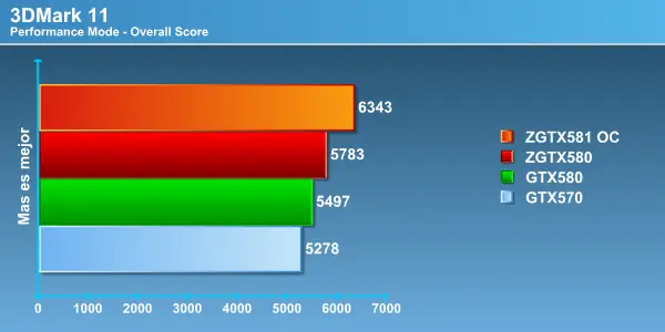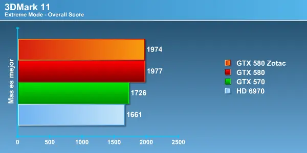 3DMark 11 es un benchmark completamente basado en DirectX 11 (Modo Rendimiento 720P, Modo Extremo 1080P) , donde NVIDIA dice tener una arquitectura mejor preparada y lo demuestra casi aplastando en el modo extremo al resto de sus competidoras. La diferencia de puntajes entre la 580 de referencia y la Zotac en el modo rendimiento tiene una explicación, el modelo de referencia corrió con una versión anterior de drivers, lo que seguramente se traduce en esta diferencia, aunque luego en el modo extremo no hubo diferencia alguna.