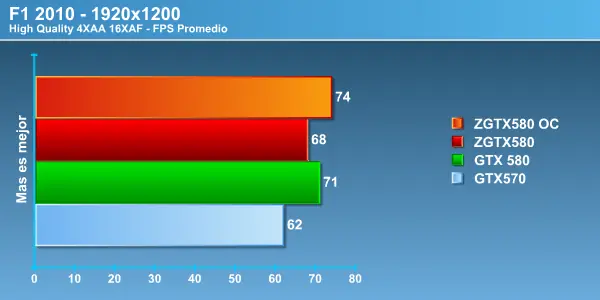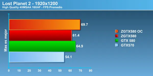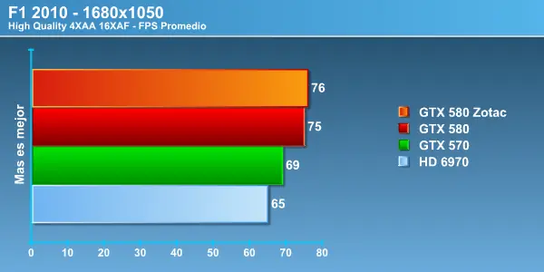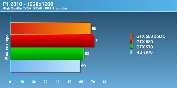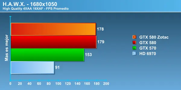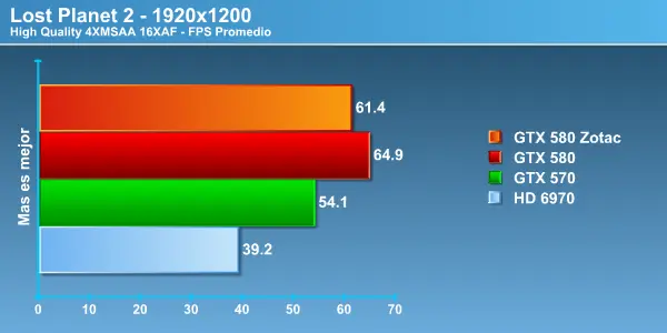 Acá nuevamente tenemos una gran diferencia entre la Zotac GTX 580 y el modelo de referencia, lo que nos permite apreciar la importancia entre un driver de lanzamiento y uno mucho más maduro que se complementa de mejor forma con el hardware, la diferencia es notoria, más de 10 Fps en 1680 y 10 exactos en 1920, el comportamiento fue muy parejo no mostrando grandes curvas en los FPS entregados. Más que aceptable rendimiento si consideramos la exigencia gráfica con la que corremos las pruebas. Este es un motor DirectX 10 y aún así la HD6970 no logra poner en apuro a las tope de linea de NVIDIA . No olvidar que entre la HD6970 y la la GTX 570 hay una diferencia de 150 dólares contra la GTX 580 , por lo que es importante la diferencia de rendimiento que se produce por dólar invertido. Recordemos una vez más que AMD aún no tiene una tarjeta de video en el segmento de la GTX 580 ya que su nueva estrella HD6990 busca competir contra el próximo lanzamiento de NVIDIA la GTX 590