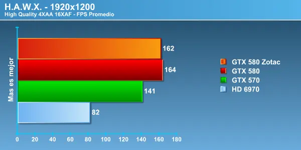 Pedimos disculpas por no actualizar el título de este juego. Desde este review cambiamos H.A.W.X 2 que presenta mayores exigencias sobre todo por su teselación en los paisajes, francamente hacen que los escenarios se vean fantásticos. Este es otro juego DirectX 11 y como es de suponer NVIDIA se impone y por bastante, tanto así que si este es tu juego no estarías más que botando tu dinero de no adquirir una VGA NVIDIA de las que estamos probando acá. Si tu presupuesto es ilimitado la GTX 580 sin duda te entrega la mejor experiencia y en competencias del mismo valor la GTX 570 se impone por bastante a la HD 6970.