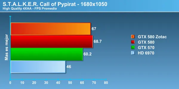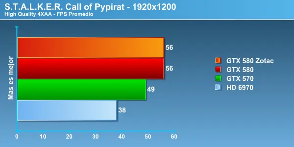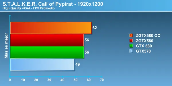 Stalker, un juego altamente demandante nos muestra lo mismo, hay que señalar que los peaks de FPS fueron muy estables no presentando saltos y mostrando una excelente estabilidad en las GTX 580 .