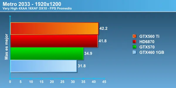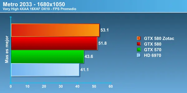 Metro 2033 el juego más demandante de nuestra batería. El único que corremos con filtros apagados para poder (corrigiendo detalles de filtros en la glosa de los gráficos) Acá incluso la variación en esta configuración hace molesto el juego incluso con la GTX580 en algunas secciones del escenario no se logra superar los 20FPS, pero bueno esta es la razón de por cual usamos este juego. Los resultados son coherentes con todos los vistos anteriormente.