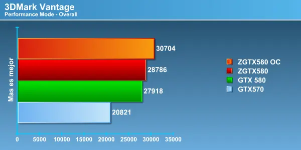 Como les comentamos en el apartado de metodología, desde este review dejaríamos la tecnología Physx de NVIDIA por defecto en su driver, claramente Vantage se beneficia de esto y simplemente la GTX580 destroza a las competidoras. Siendo muy notorio en el Overall Score.