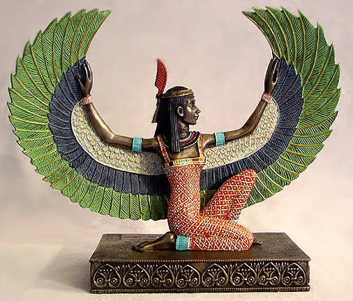 Diosa que personifíca el trono. Era llamada "madre de los dioses". Fue, sin duda la más popular de las diosas egipcias. En el ciclo de Osiris, Isis tiene el p apel de esposa del dios, y es madre de Horus. Modelo para esposas y madres. Ella fue quien reconstruyó con extraños procedimientos el cadáver de su esposo Osiris, y procreó, con él a Horus. Protegió a su hijo Horus con uñas y dientes de las agresiones de su tio Set. Era el símbolo de la semilla, crecimiento y seguridad de la vida. Cuando Osiris se solarizó, Isis pasó a ser madre y esposa del Sol. Como madre de las estrellas simbolizó el cielo de la noche. Por ello fue asimilada a la diosa Hathor, representándose con forma humana y con el disco solar entre los cuernos sobre su cabeza. La representación más habitual de Isis era como una mujer con un trono en la cabeza. El cual es el jeroglífico de su nombre.