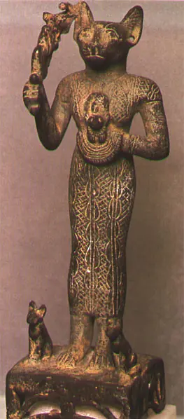 Esta diosa se presentaba como una mujer con cabeza de gato o como un gato. Representa la personificación de los rayos calientes del Sol y ejercía sus poderes benéficos. Encarnaba los aspecto pacíficos de diosas peligrosas como Sacmis, que expresaba las cualidades maléficas del Sol. Como ojo de Atum, estaba asociada a la luna y protegía los nacimientos y a las embarazadas de las enfermedades y los malos espíritus.