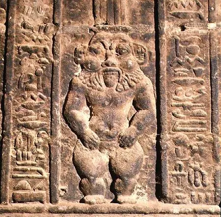 Enano con barba y melena, aparece siempre desnudo o con una piel de león, y sacando la lengua. Se le asociaba con los niños y las embarazadas. A éstas las asistía en el parto y las protegía de los espíritus malignos con unos cuchillos. Su figura se convirtió en amuleto.