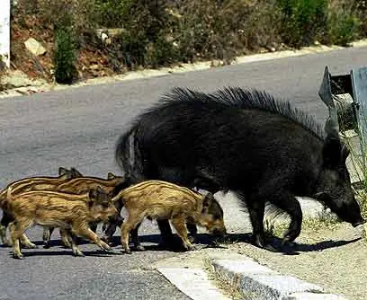 Una madre jabalí con sus cuatro jabatos, en Barcelona, España.