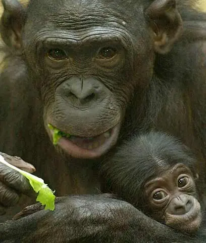 Cuando los bonobos se enamoran se van a vivir juntos y tienen una cría, pero si la hembra sigue enamorada lleva el cachorro a la abuela.+