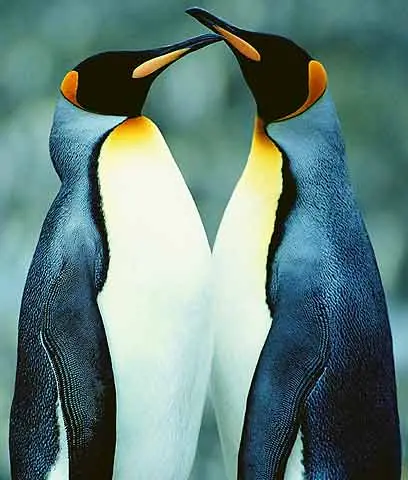 Una pareja de pingüinos rey besándose. Durante su cortejo se produce el frote de picos, emisión de sonidos como trompetas o imitarse mutuamente en sus comportamientos.