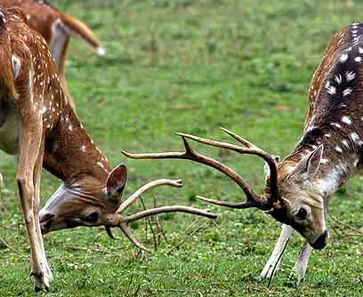 Venados machos pelean para probar su fuerza en el zoológico de Guwahati, en la India.