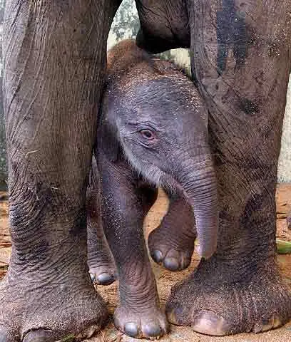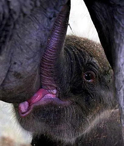 Cría de elefante alimentada por su madre en el Parque de Bogor de la isla de Sumatra.